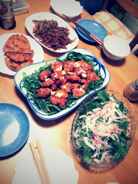 きんぴらごぼうと、チキンの南蛮漬けと、カニカマのサラダ。